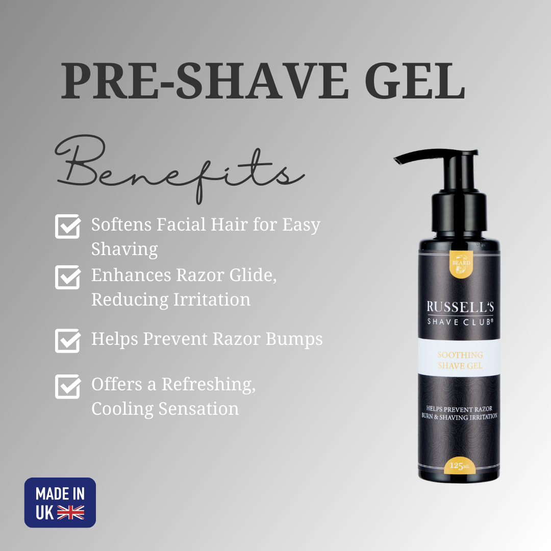 Enhance Your Beard Styling: Discover the versatility of Russell's Soothing Pre-Shave Gel, an excellent complement for any shaving routine, especially when you're sculpting or doing beard line-ups.