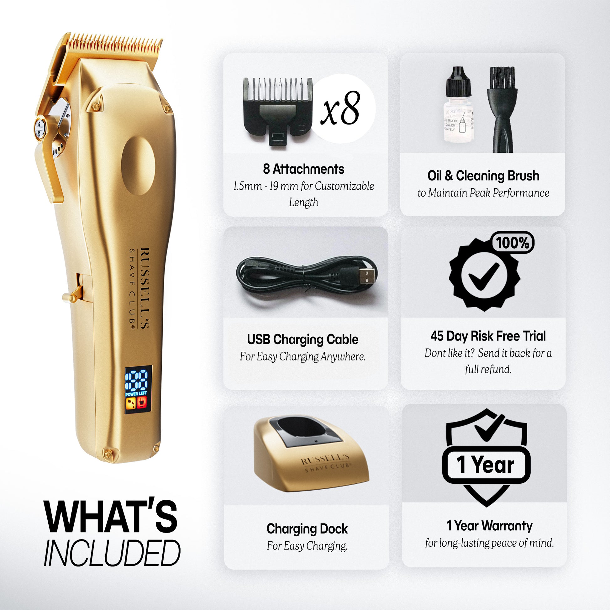 Adjustable taper lever, 8 guide combs (1.5–19mm)